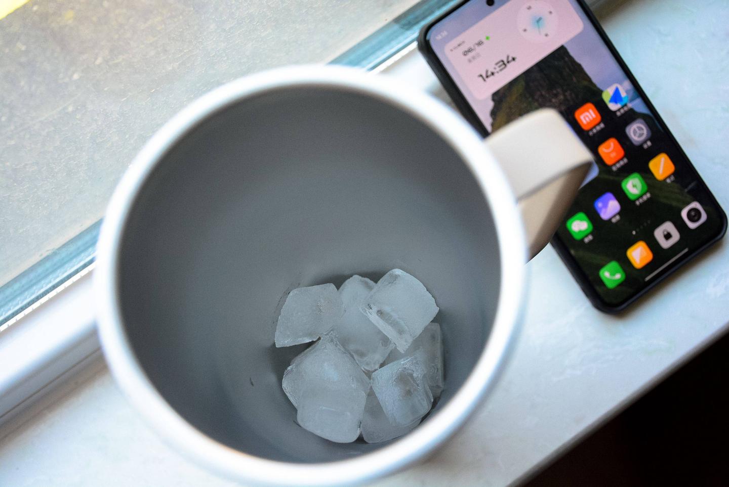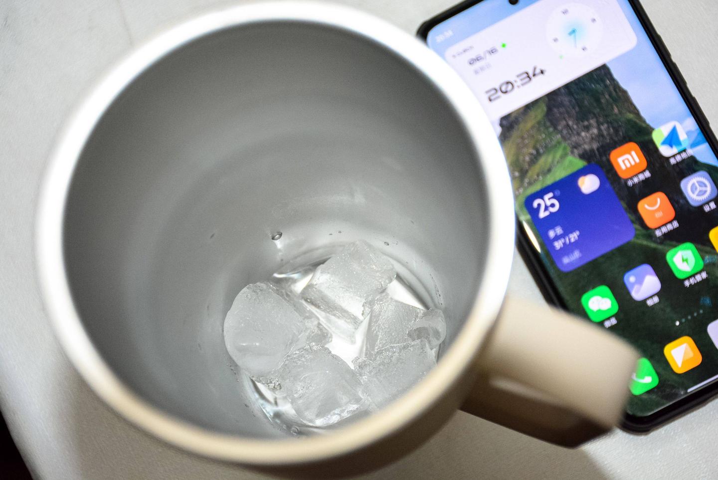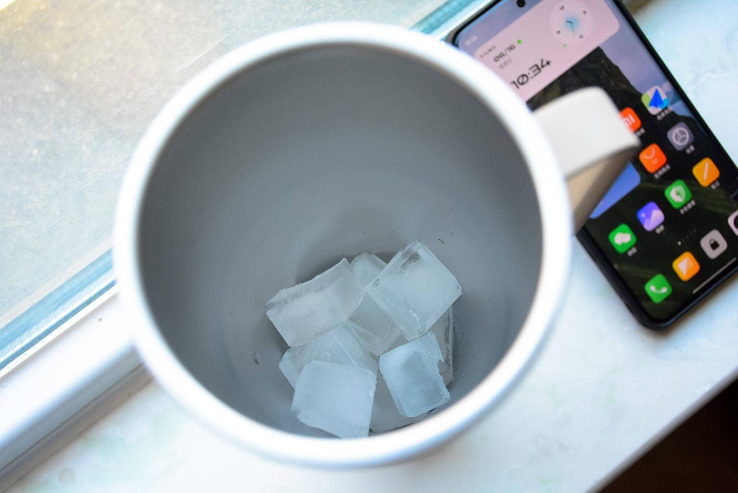 The time was 10:34, I put some ice cubes into the cool leather thermos cup, then closed the lid and waited for the time to pass minute by minute. The thermos cup is placed at home without direct light; The temperature at home is about 26°C, and it has rained continuously in the past few days, and the weather is not hot.