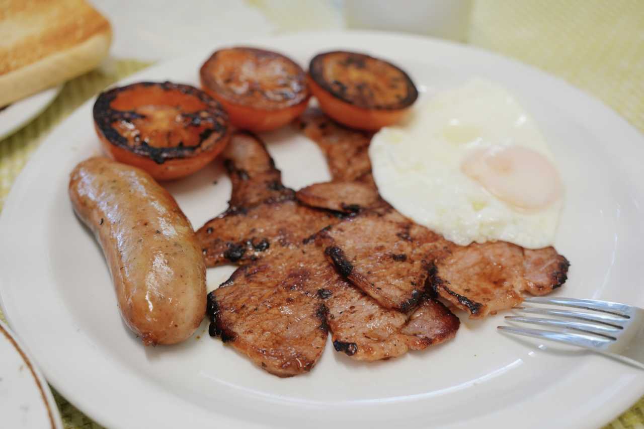 Traditional English brunch: scrambled eggs, sausages, baked beans, hash browns, grilled tomatoes, assorted toast and buns. Every hotel breakfast served these—fresh at first, by day four we were done