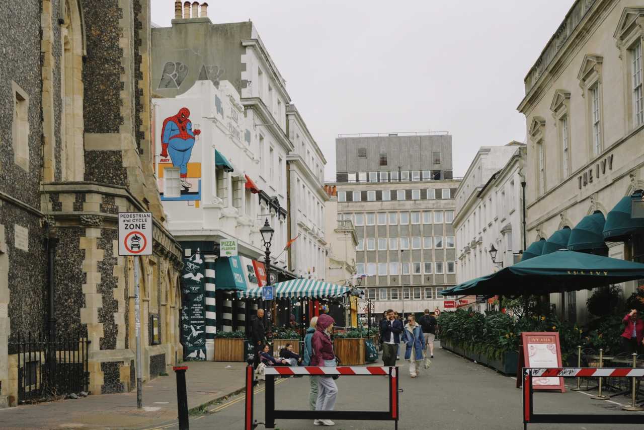 In the afternoon, wind and rain were too strong—we had to return to the hotel for a nap. Woke past five, went out to find most shops already closed, so we simply strolled streets. Passing the North Laine area, the street art vibe was full—this district is known for vintage/secondhand clothing shops, indie designer stores, record shops, bookstores, specialty cafés and bars, and street graffiti.
