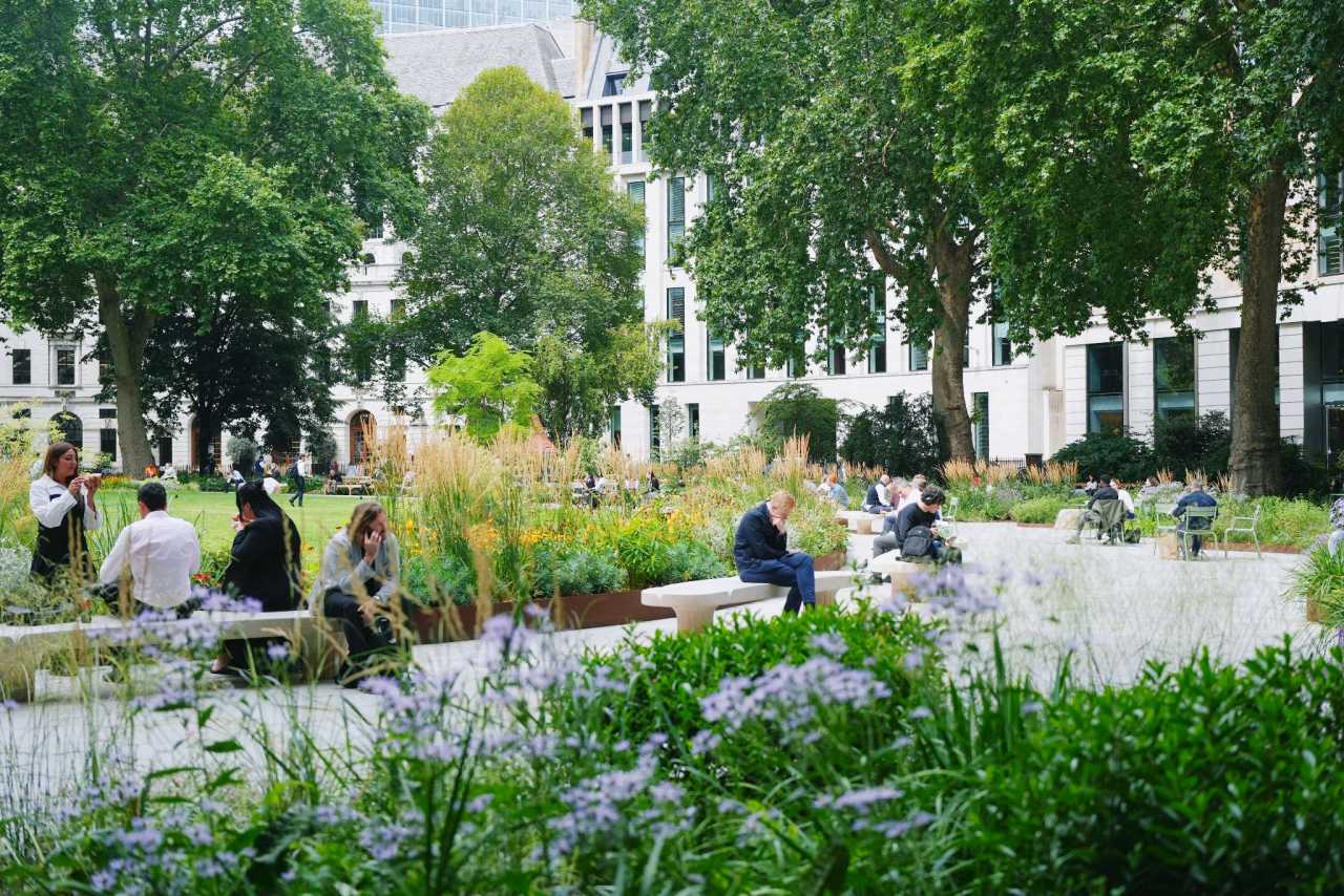 Delicate pocket parks—lunchtime filled with people eating and chatting.