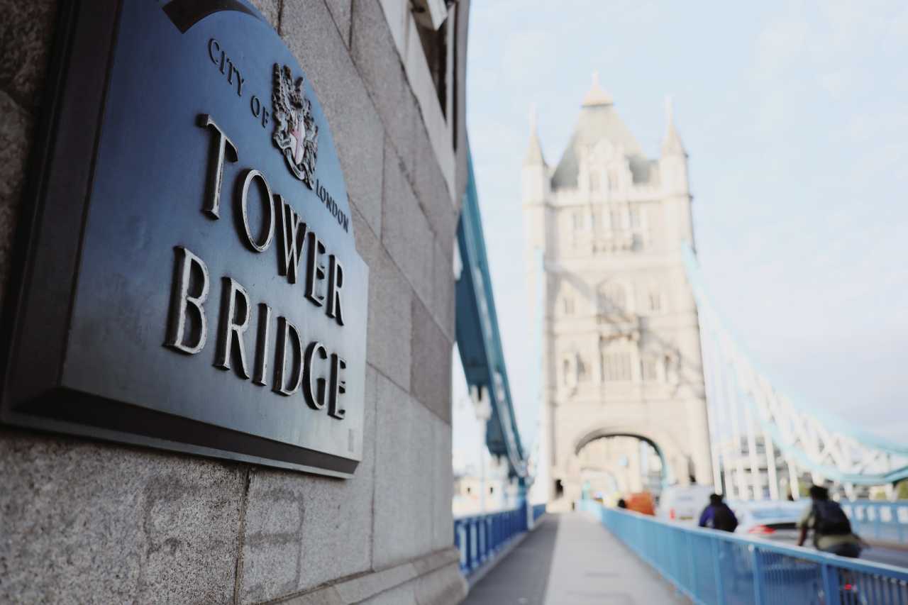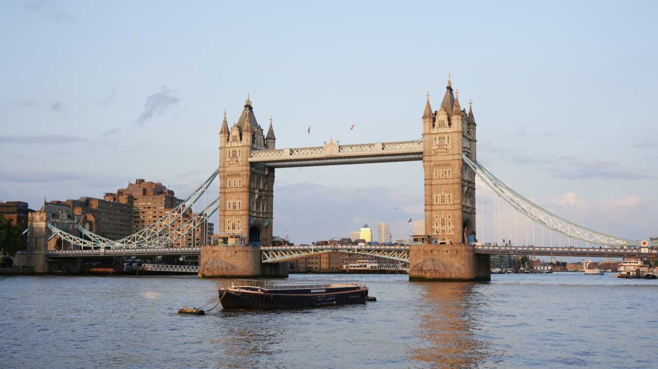 London Tower Bridge, crisscrossing streets, the gently flowing Thames, and staggered buildings are all within sight.