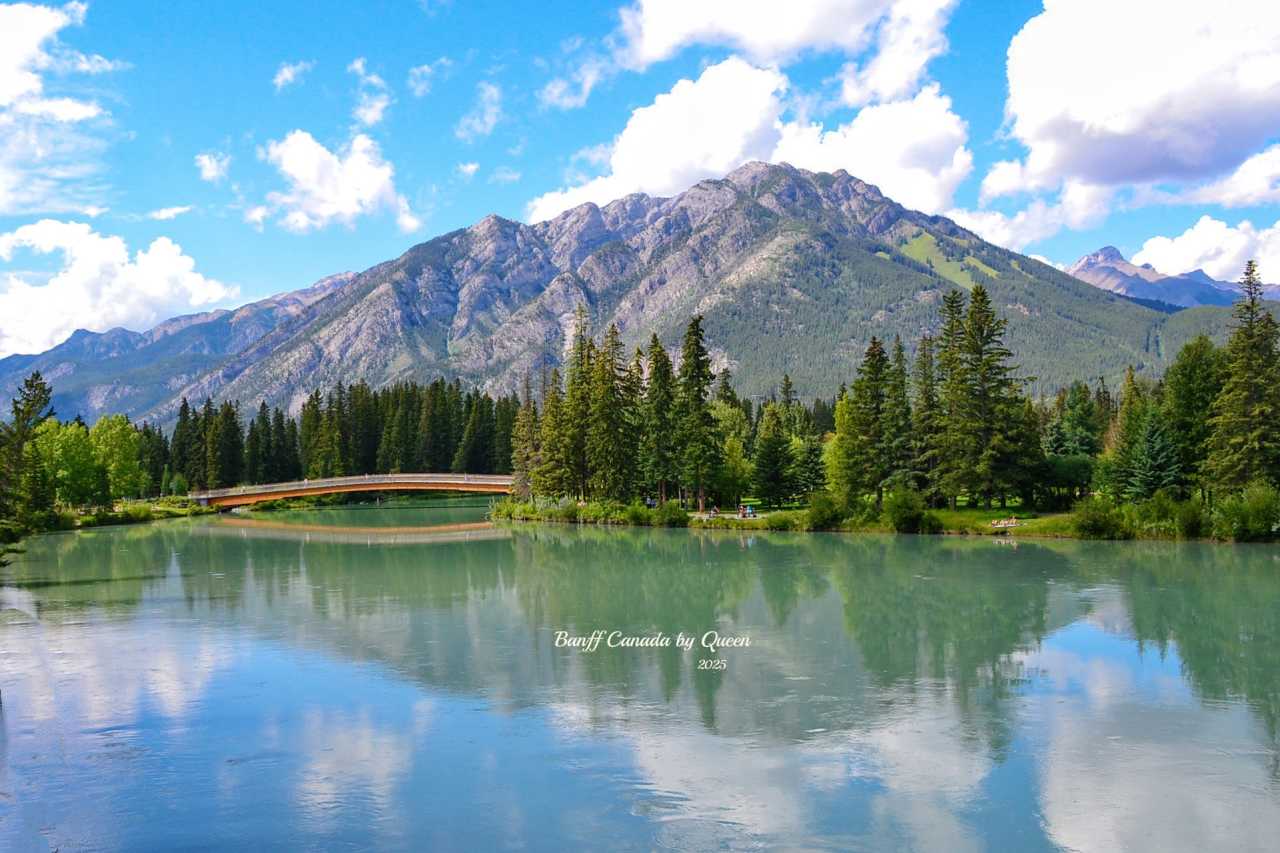 Walking back, crossing that old bridge spanning Bow River, the bridge body is ancient, standing on the bridge you can see beautiful scenery on both banks.