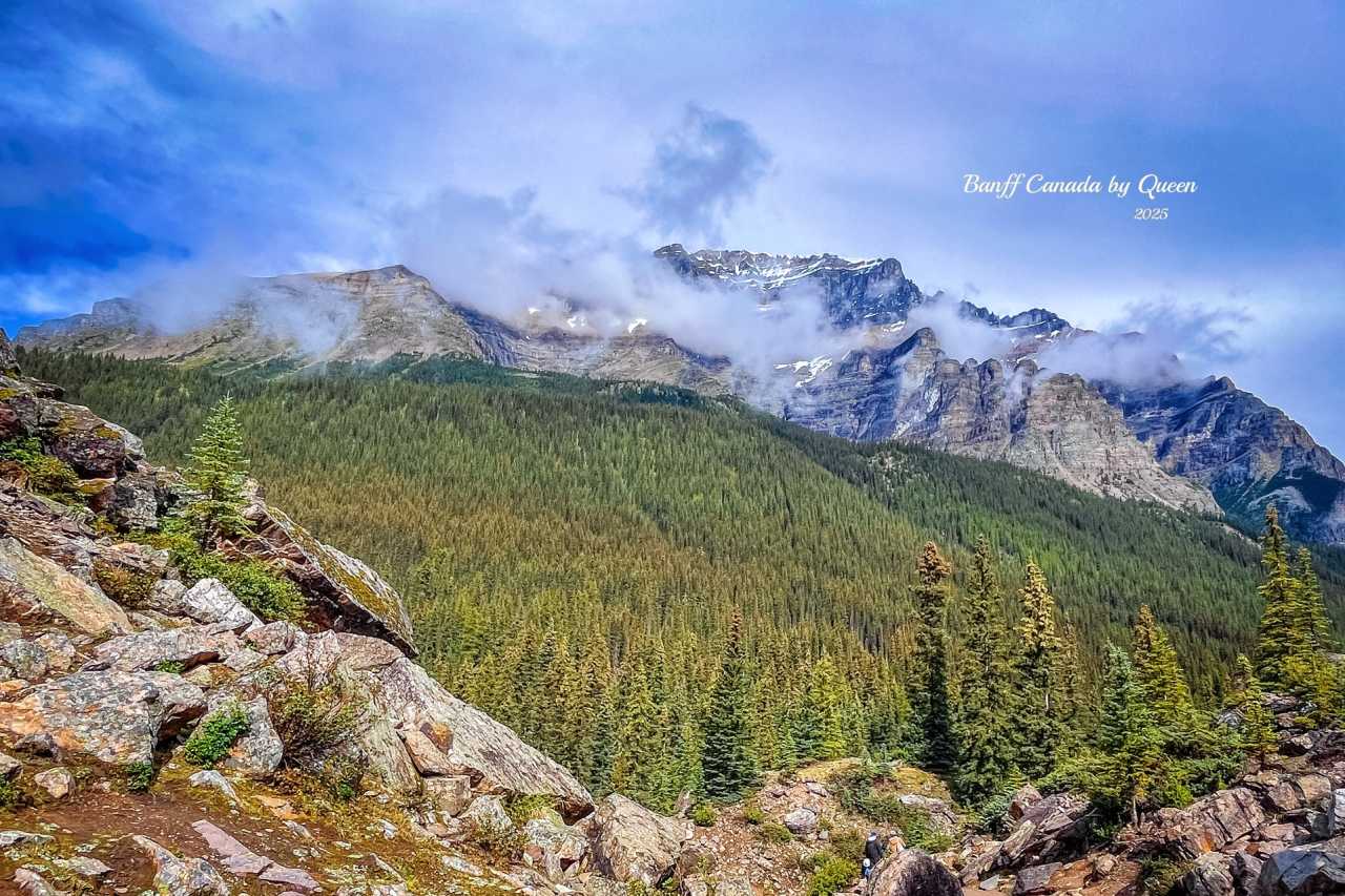When reaching the mountaintop, that moment really takes your breath away. The lake water is unrealistically blue, that rich sapphire blue, like colors blended by snow mountains and sunlight, carrying the clarity after glacier melt, yet more transparent than any filter. The lake surface is as still as a mirror, reflecting the silhouette of Valley of the Ten Peaks, as if only mountains, water and silence remain in this world.