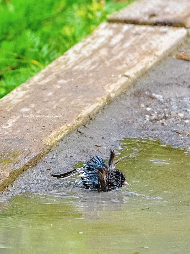 Encountered a bird taking a bath attentively. It stood in a small puddle, flapping its wings, water splashing everywhere, completely immersed in its own little world.