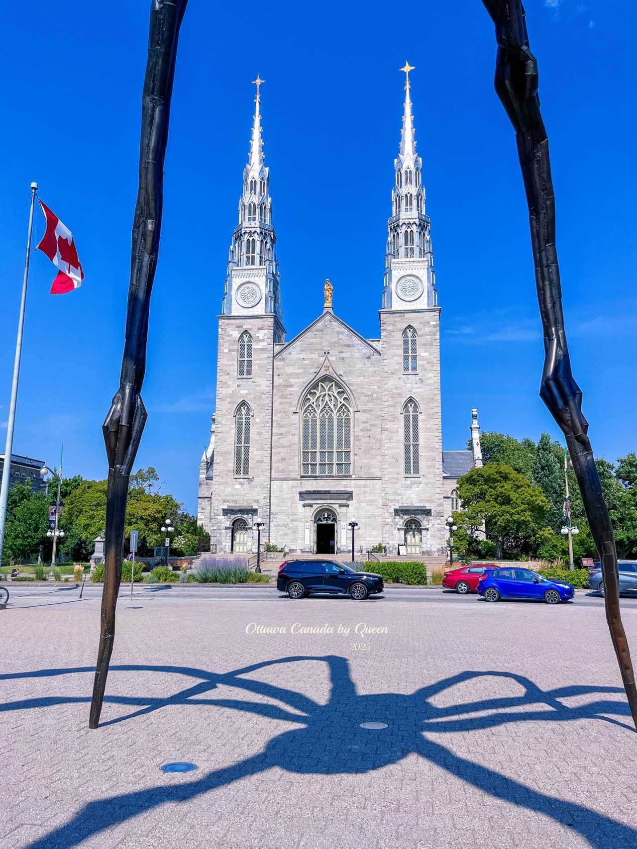 Walking across from the spider's shadow, one's gaze is involuntarily drawn to another landmark - Ottawa's oldest and most solemn church: Notre-Dame Cathedral Basilica. Her twin towers shimmer with silver light under the sun, with Gothic spires, rose windows, and blue-gold interior ceiling, exuding an almost gentle sense of sanctity.