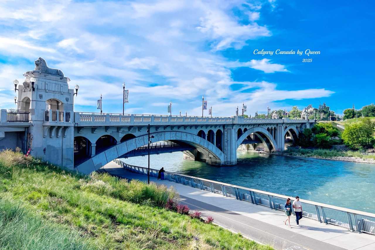 After eating and drinking, I came to the riverside walkway next to the city center and saw a white arch bridge spanning the Bow River - the Centre Street Bridge. This important traffic bridge was built in 1916 and is one of Calgary's cultural symbols. The bridge body is elegant, with white concrete structure carrying classical carvings, as if time has frozen here.