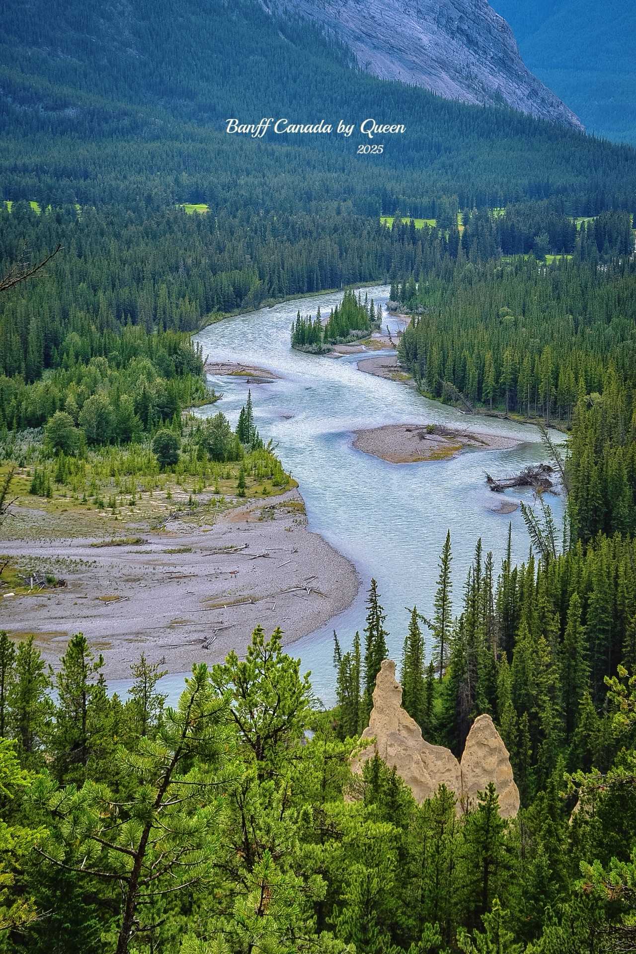 Standing on the high platform of Cascade of Time Garden, overlooking the entire Banff town. The streets lead straight to the distance, with scattered cabins along the road, majestic snow mountains in the distance, and slowly flowing Bow River below - everything is just right.